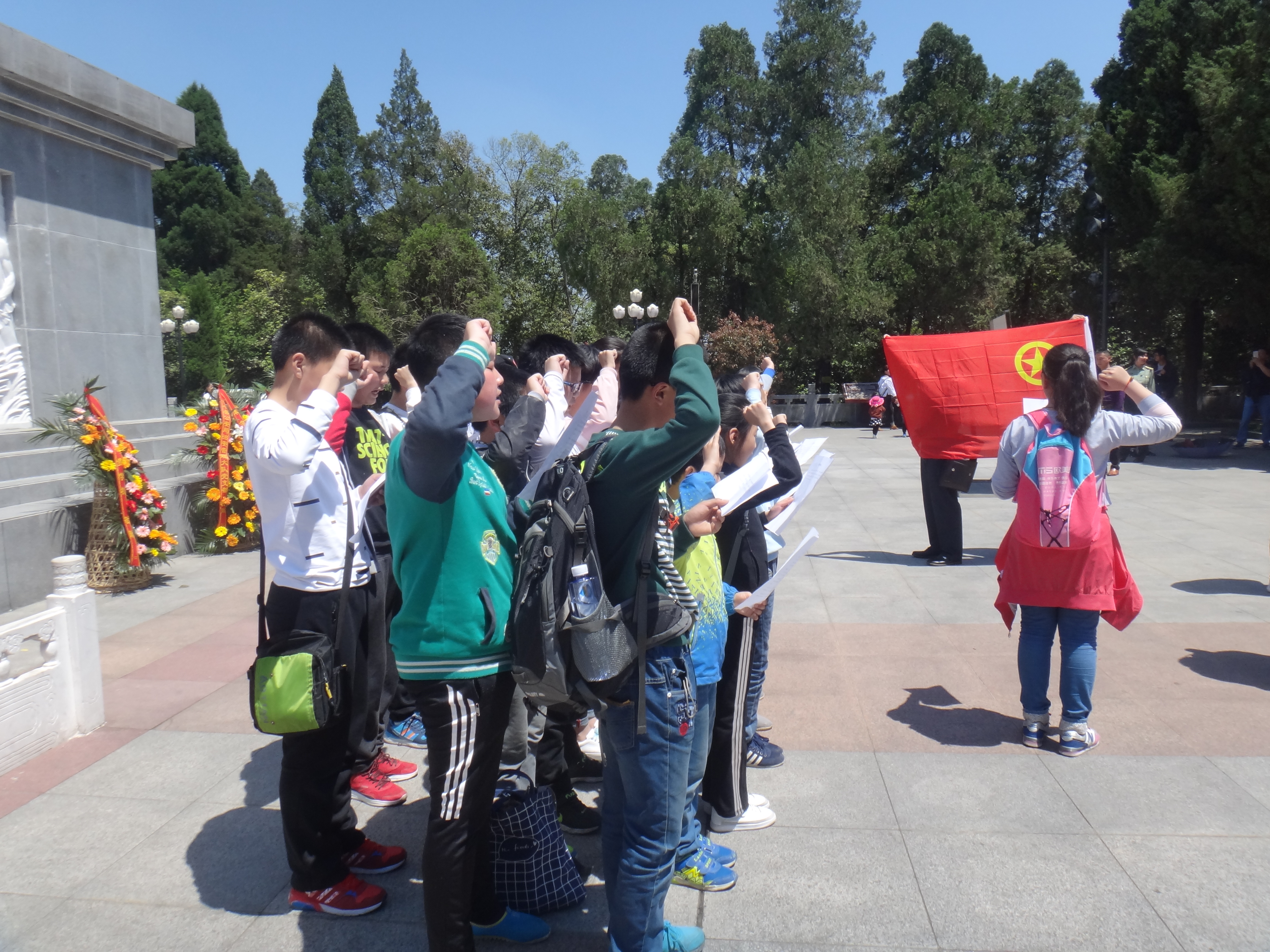金寨县被誉为“红军的摇篮、将军的故乡”,是著名的革命老区。在红军广场,小记者班学员在革命烈士纪念塔前默哀,并向纪念塔敬献花篮,面对团旗庄严宣誓,重温入团誓词。